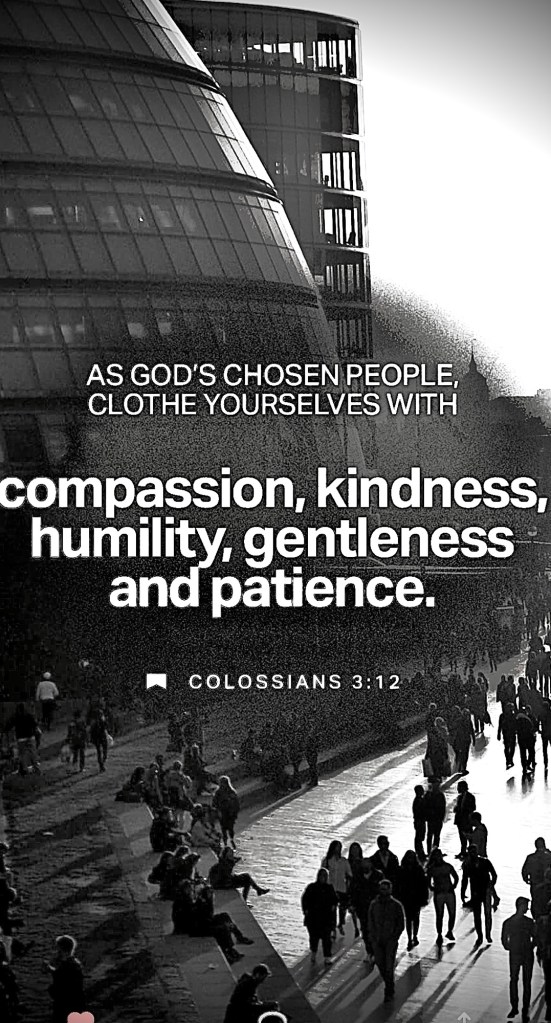Colossians 3:12 = โ€œโ€ฆclothe yourself with compassion, kindness, humility, gentleness, and patienceโ€ฆโ€